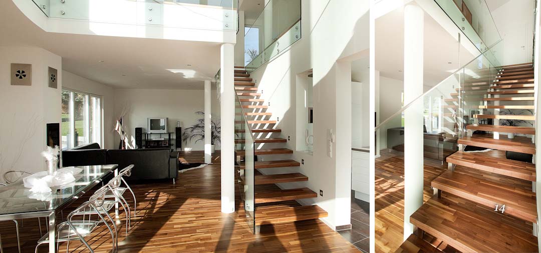Der Kunde bekam auch diese, ebenso moderne, Holzstiege von uns. Die offene Variante der Innenstiegen sparen Platz und schauen gleichzeitig auch noch gut aus.